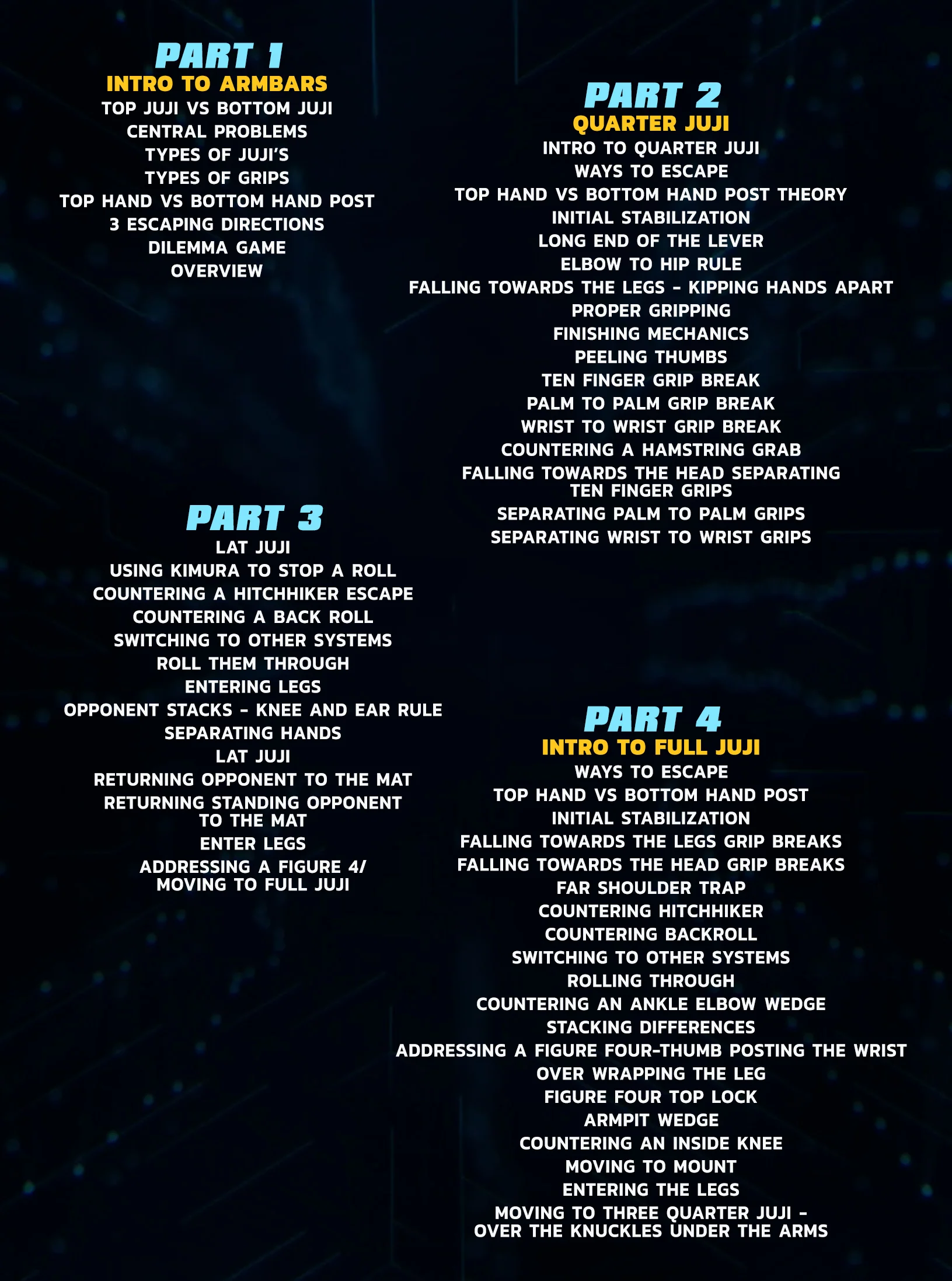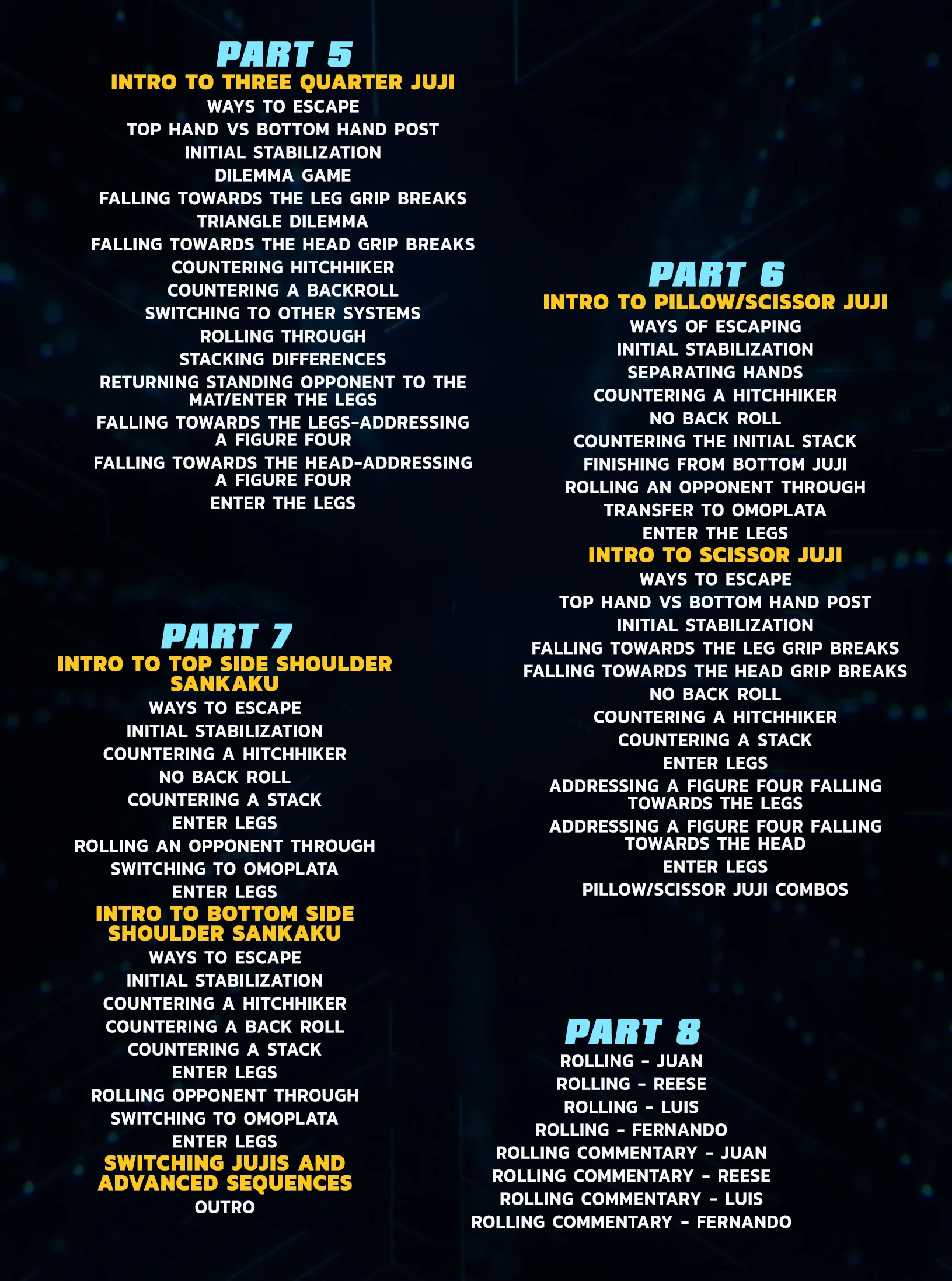 - Learn Juji variations like quarter Juji, full Juji, three quarter Juji, Pillow/Scissor Juji, as well as complimentary attacks that present themselves during the Juji process.