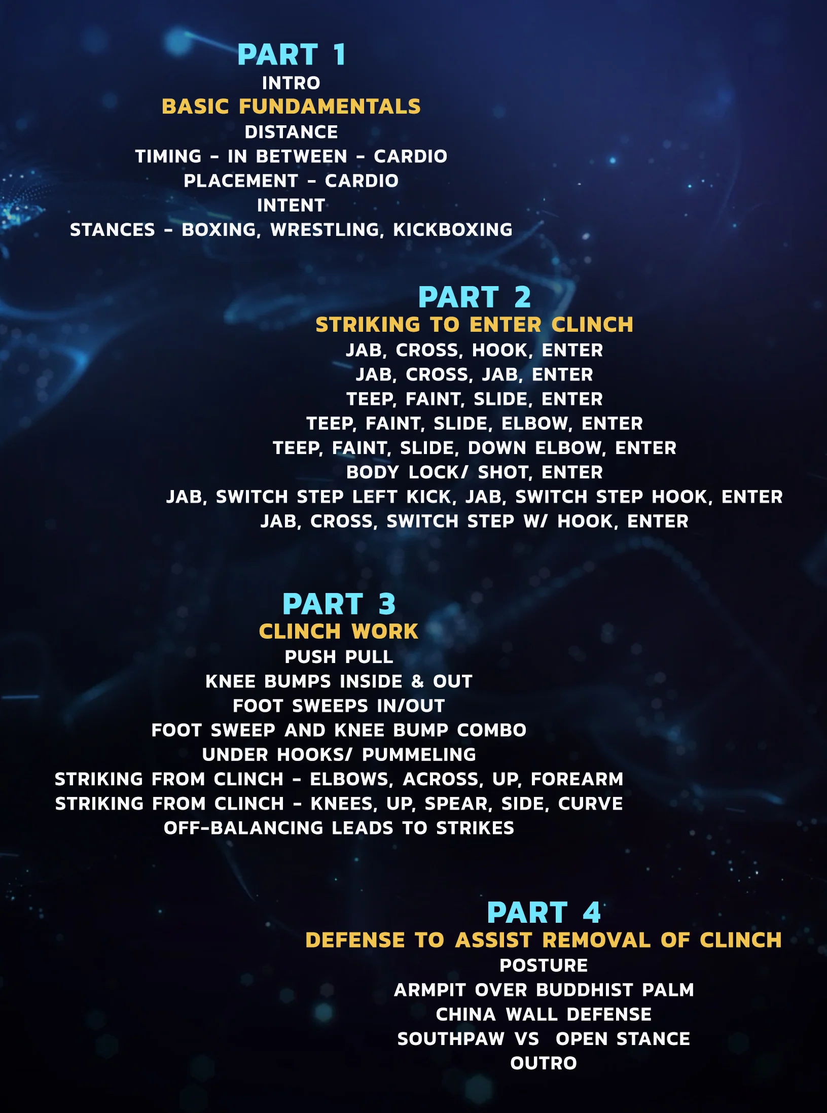 - Learn essentials of the clinch including fundamentals, entries, clinch work, and even defensive measures to utilize in the clinch!